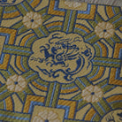 Set against a golden-brown background, the textile features an elegant arrangement of three colors—yellow-green (moegi), light blue (hanada), and red—applied in a style reminiscent of ungen (delicate color gradation). The refined design includes a qilin (mythical beast) enclosed in a circle, a dragon within a floral roundel (rinbana), and a six-petaled flower placed inside a square, all contributing to the graceful and dignified character of the brocade.