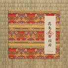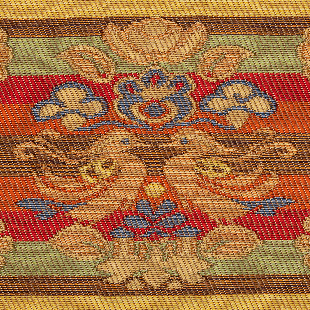 This textile draws inspiration from Shōsōin fabrics. It features a floral-and-bird motif, with a pair of waterfowl facing each other while seated on stylized floral pedestals, each holding a flowering branch in its beak. The color scheme is rich and graceful, full of elegance and refinement.