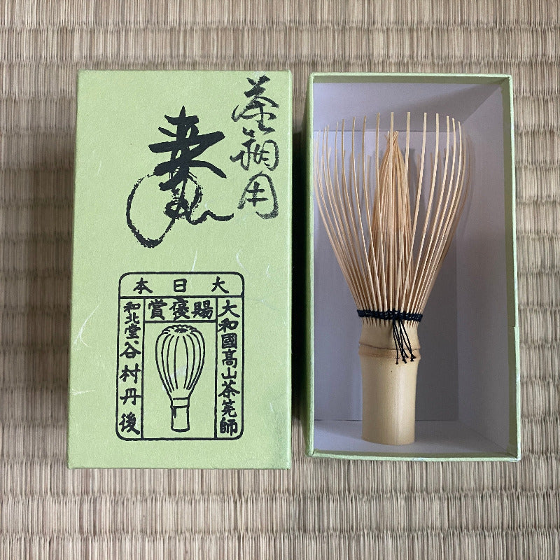 This Shin-style white bamboo chasen is handcrafted by Tanimura Tango, the 20th-generation master tea whisk artisan from Takayama, Nara.
