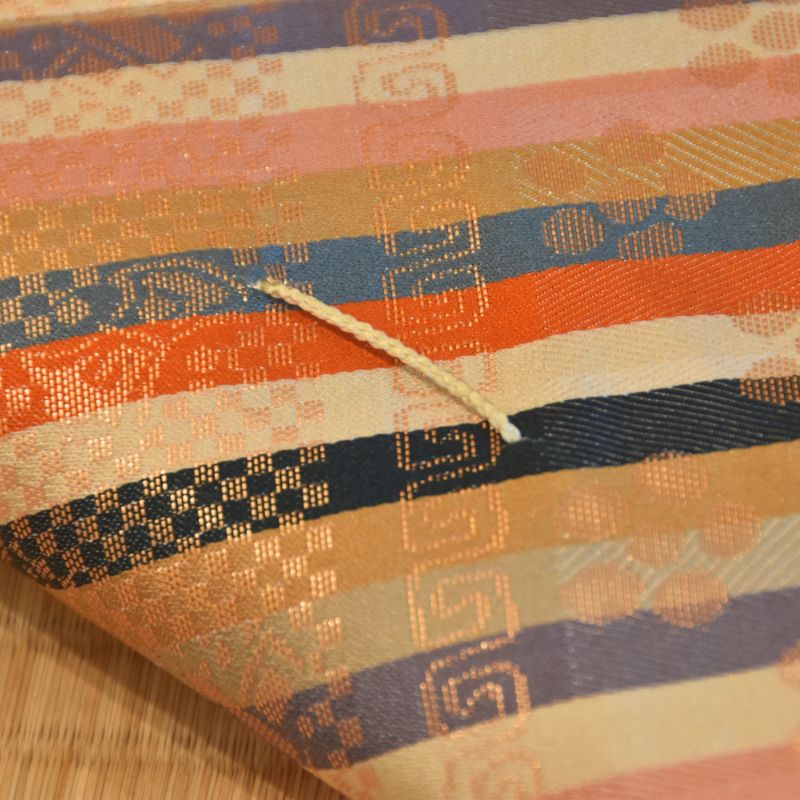 This fabric is a kinran (gold brocade) rendition of the famous meibutsugire pattern “Iyo Sudare Junko.”