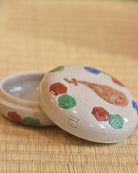 A kōgō is a small lidded container used to hold incense. It is traditionally used in the charcoal preparation ritual of Japanese tea ceremonies and is also valued as a decorative or collectible item. The choice of materials and designs enhances the seasonal ambiance and the aesthetics of the tea setting.