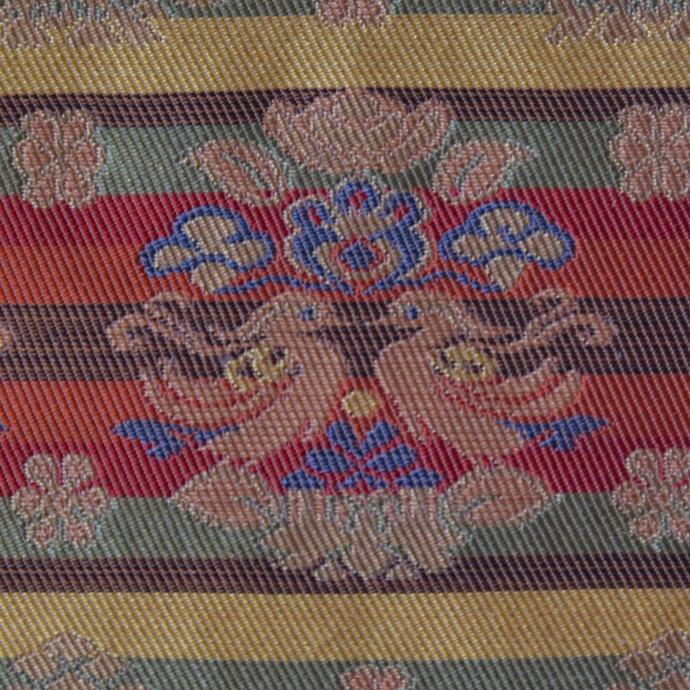 This textile draws inspiration from Shōsōin fabrics. It features a floral-and-bird motif, with a pair of waterfowl facing each other while seated on stylized floral pedestals, each holding a flowering branch in its beak. The color scheme is rich and graceful, full of elegance and refinement.