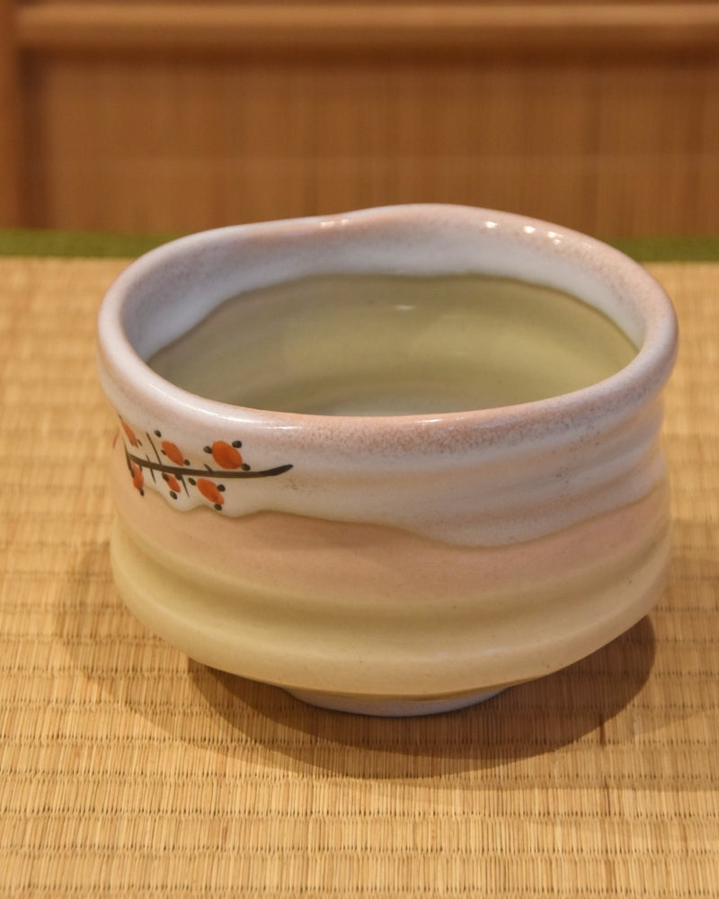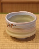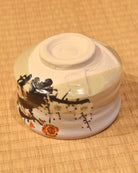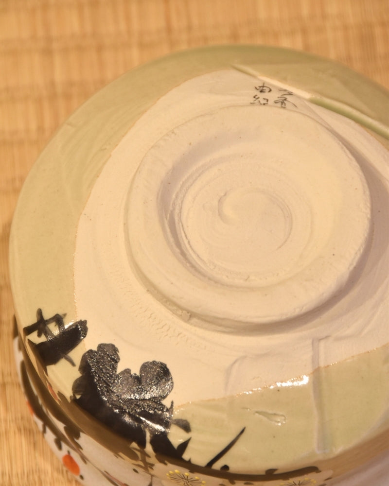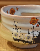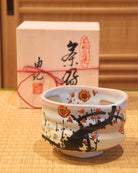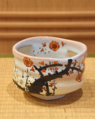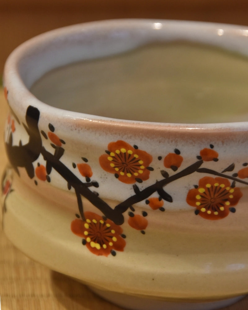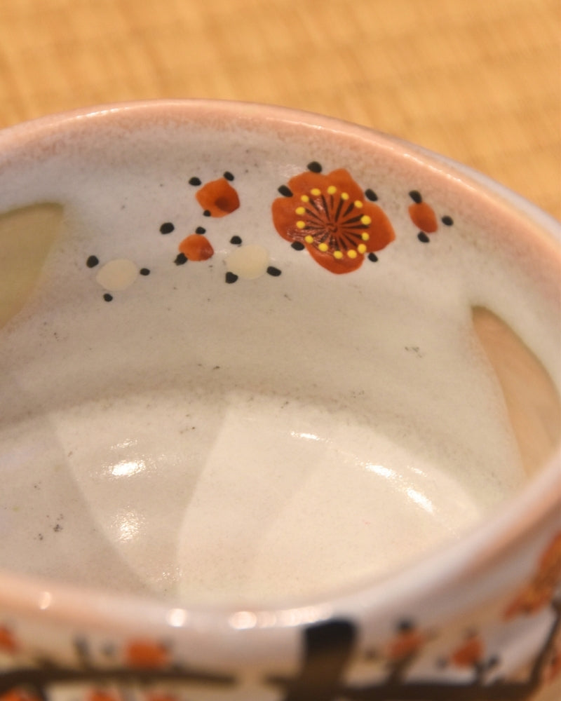 A Kutani ware matcha bowl hand-painted with plum blossoms and a scenic landscape, featuring gold accents and a refined color palette for an elegant tea or decorative experience.