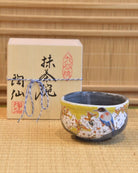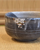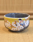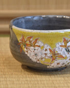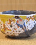 A Kutani ware matcha bowl featuring a beautiful bird perched among cherry blossom branches, capturing the serene beauty of spring with traditional Japanese craftsmanship.