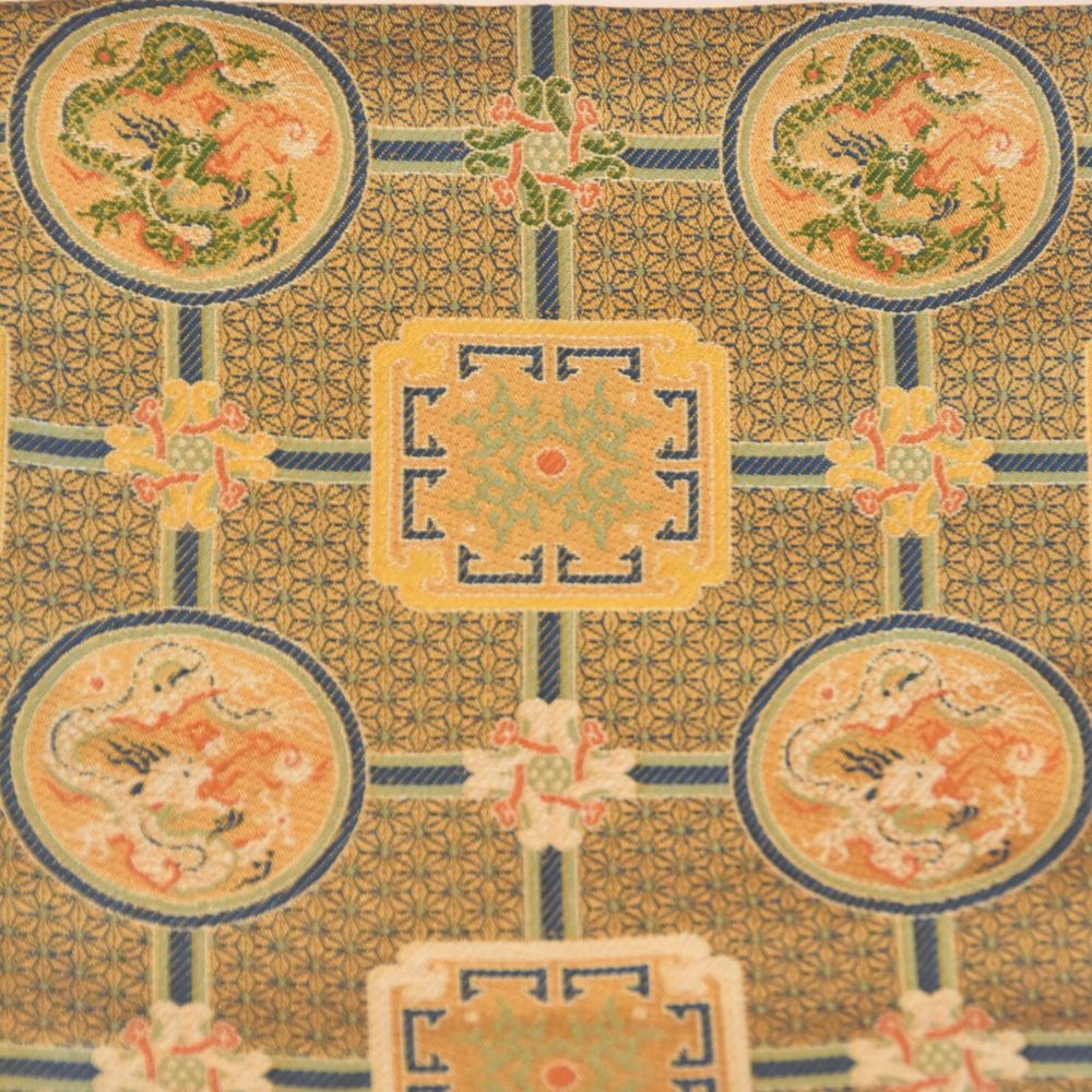 One type of meibutsugire (famous patterned textile). It features intricate designs using many colored threads, including the Shokko pattern and depictions of the Blue Dragon and White Dragon within circular motifs. "Banreki" refers to the Ming era (1573–1619) of the Ming dynasty in China, a period that produced many renowned "meibutsugire" textiles.