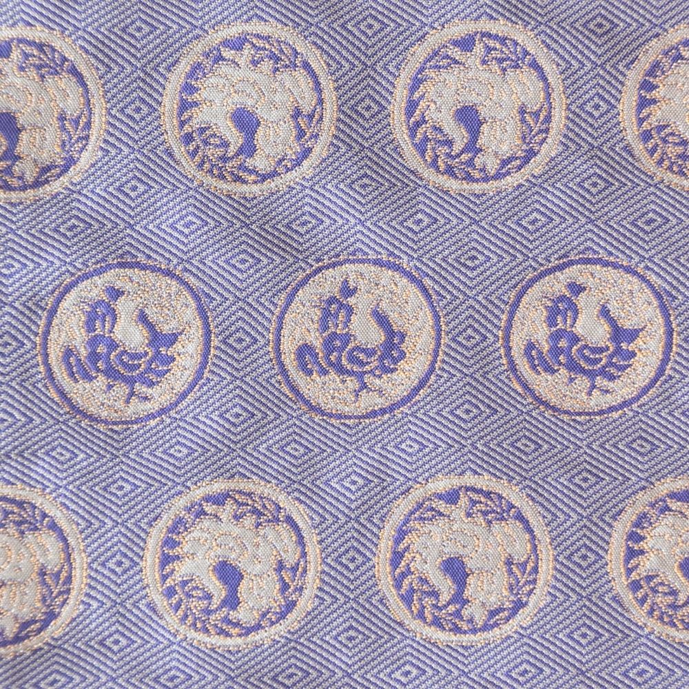 The rooster, one of the twelve zodiac animals, has long been cherished as a bird that heralds the time, and has been used as a decorative motif on vessels and other objects since ancient China. While many textiles feature bird patterns such as phoenixes and cranes, it is rare to find one adorned with so many roosters. By alternating the orientation of the roosters in each row, the design achieves an orderly arrangement while retaining a gentle impression. The diamond-shaped stone pavement background is also striking.