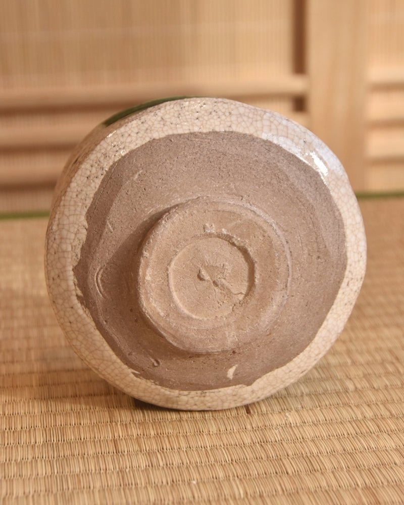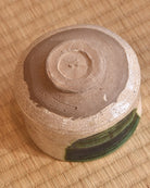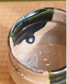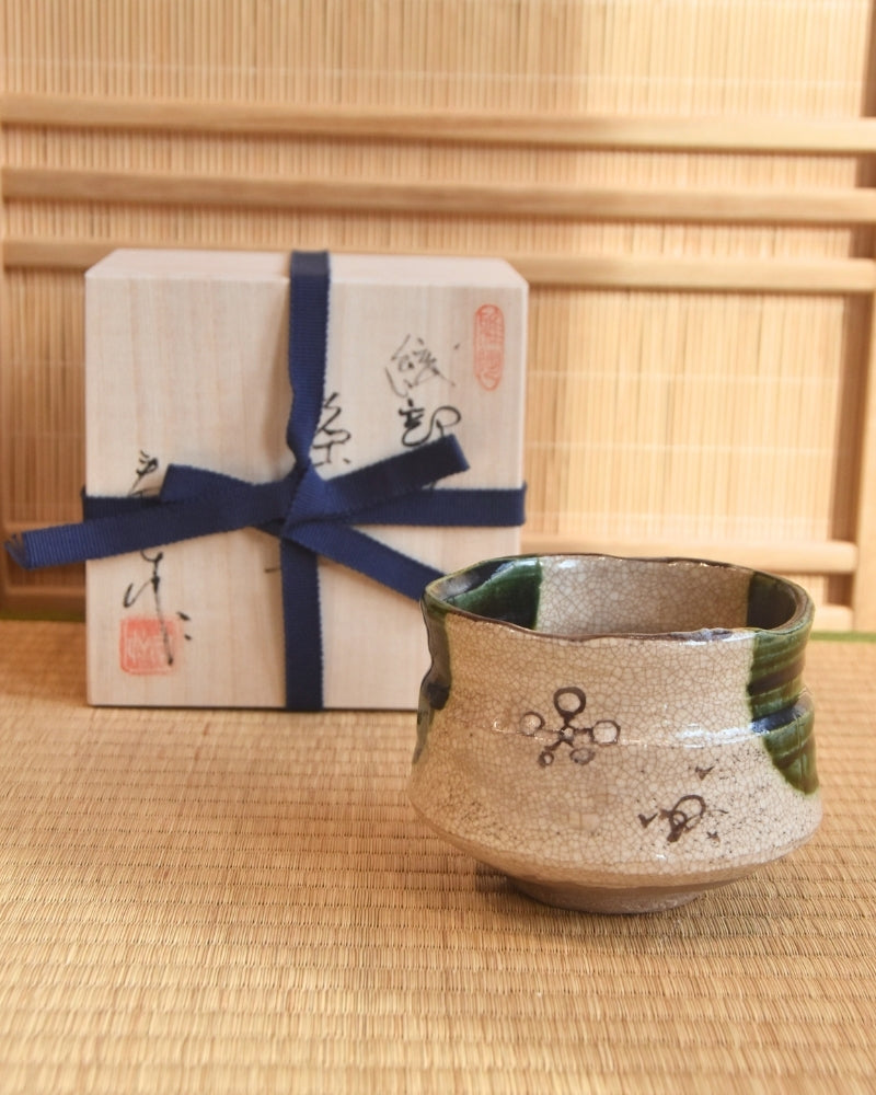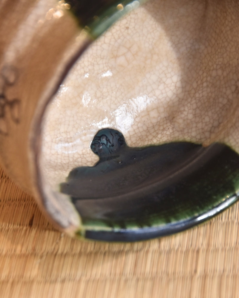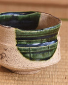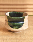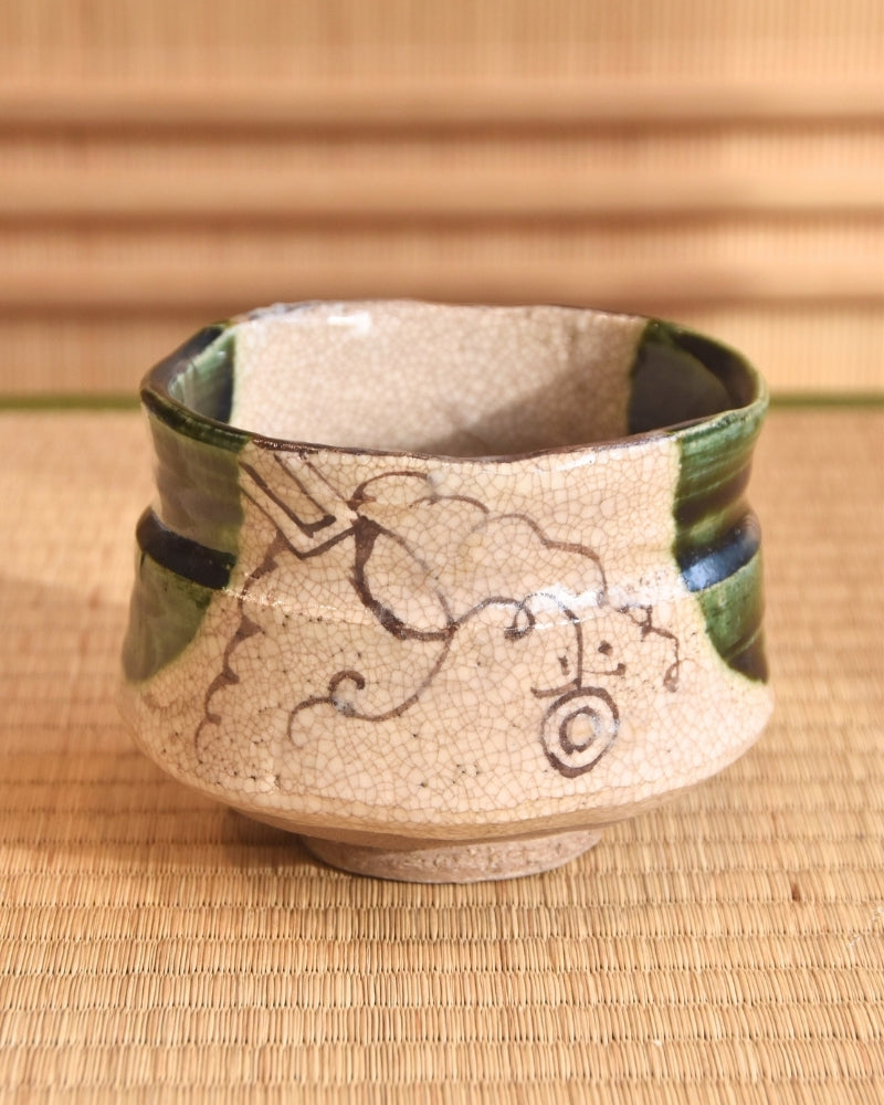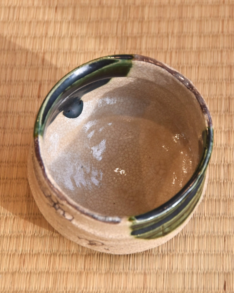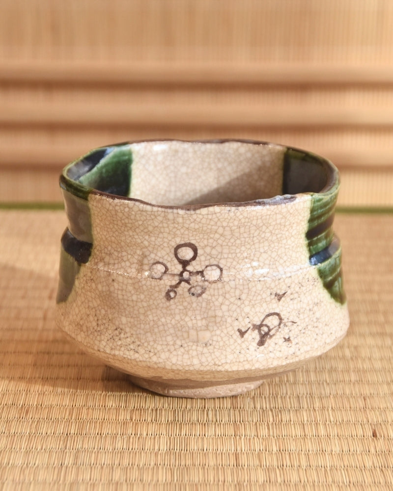 Oribe is a type of Mino ware that originated in the Azuchi-Momoyama period and was named after the daimyo tea master Furuta Oribe from Mino. It is known for its innovative shapes and patterns that defied traditional tea ceramics. Characteristic designs include intentionally distorted tea bowls and fan-shaped vessels, often featuring geometric patterns like checkered or lattice designs. Oribe ware is commonly recognized for its use of copper-green glaze, which gives the pottery its distinctive green color.
