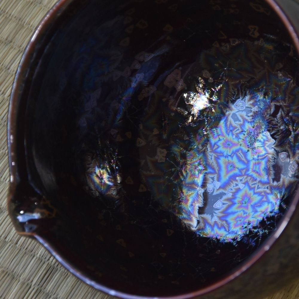 The delicate star-like crystalline patterns that appear on the surface are naturally formed during firing, as the glaze components crystallize under specific conditions. The result is a shimmering, sharp brilliance that shifts with the angle of light, offering a sense of depth and mystery. Compared to Hana-kesshō ("Flower Crystal"), which is also a type of crystal glaze, Star Crystal is characterized by a more angular, radiant appearance.