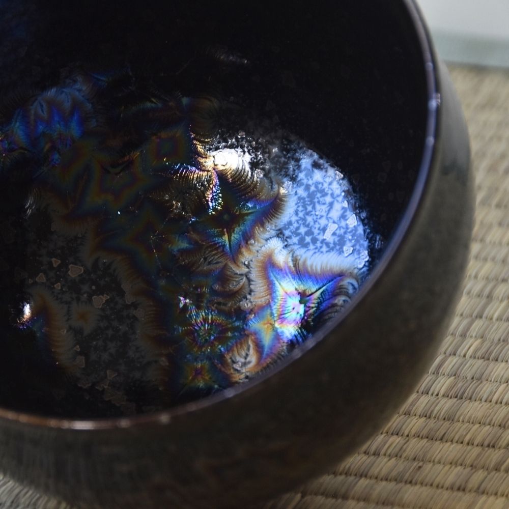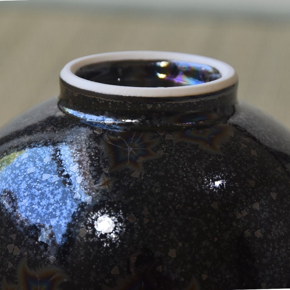 The delicate star-like crystalline patterns that appear on the surface are naturally formed during firing, as the glaze components crystallize under specific conditions. The result is a shimmering, sharp brilliance that shifts with the angle of light, offering a sense of depth and mystery. Compared to Hana-kesshō ("Flower Crystal"), which is also a type of crystal glaze, Star Crystal is characterized by a more angular, radiant appearance.