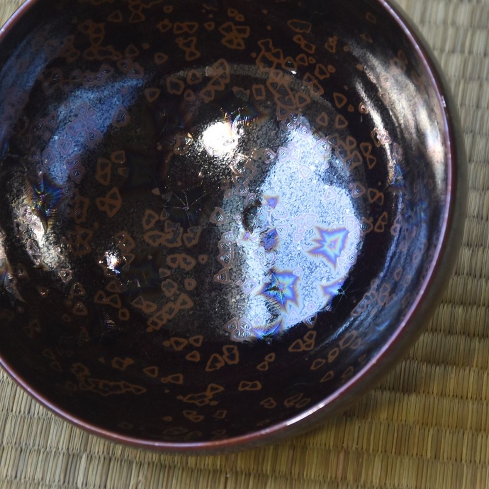 The delicate star-like crystalline patterns that appear on the surface are naturally formed during firing, as the glaze components crystallize under specific conditions. The result is a shimmering, sharp brilliance that shifts with the angle of light, offering a sense of depth and mystery. Compared to Hana-kesshō ("Flower Crystal"), which is also a type of crystal glaze, Star Crystal is characterized by a more angular, radiant appearance.