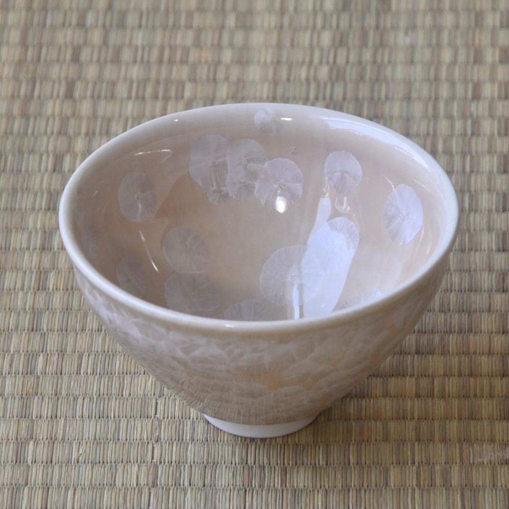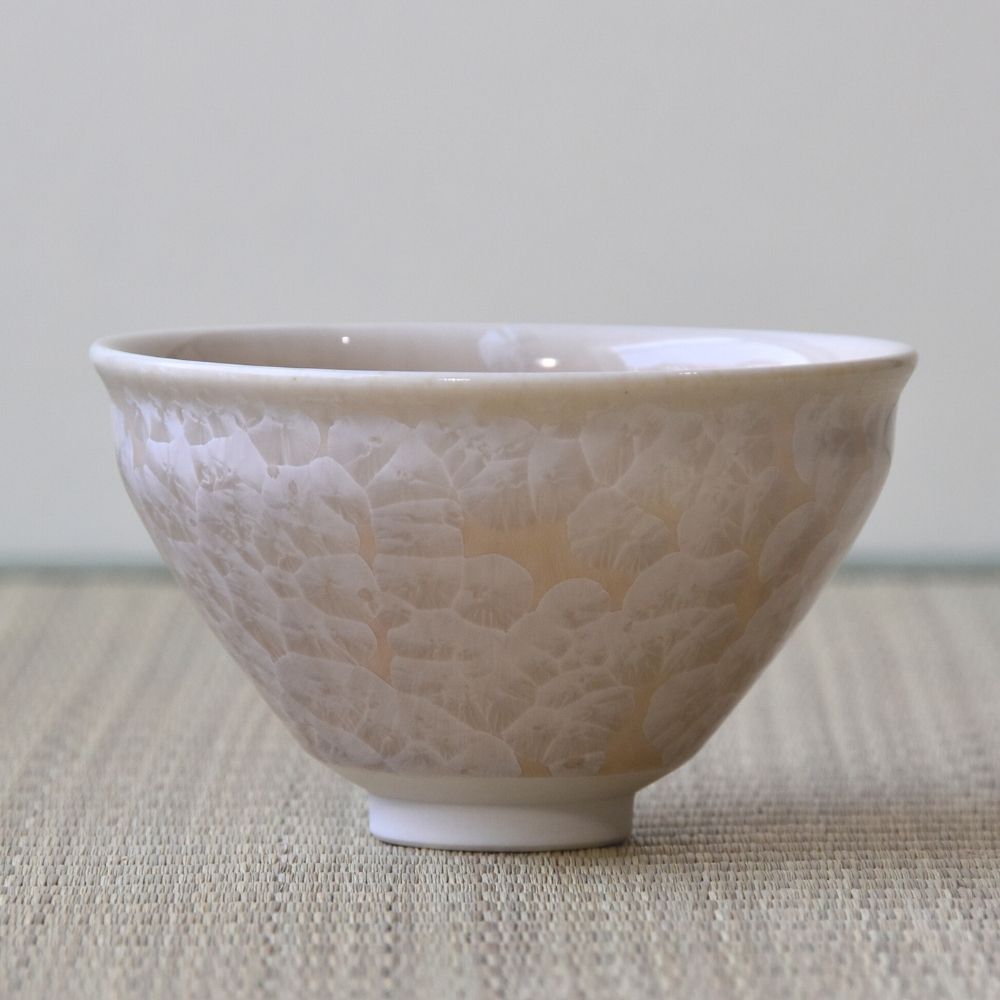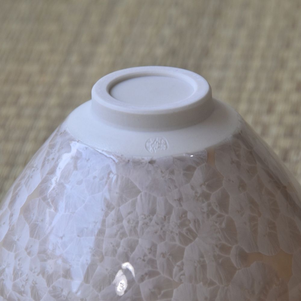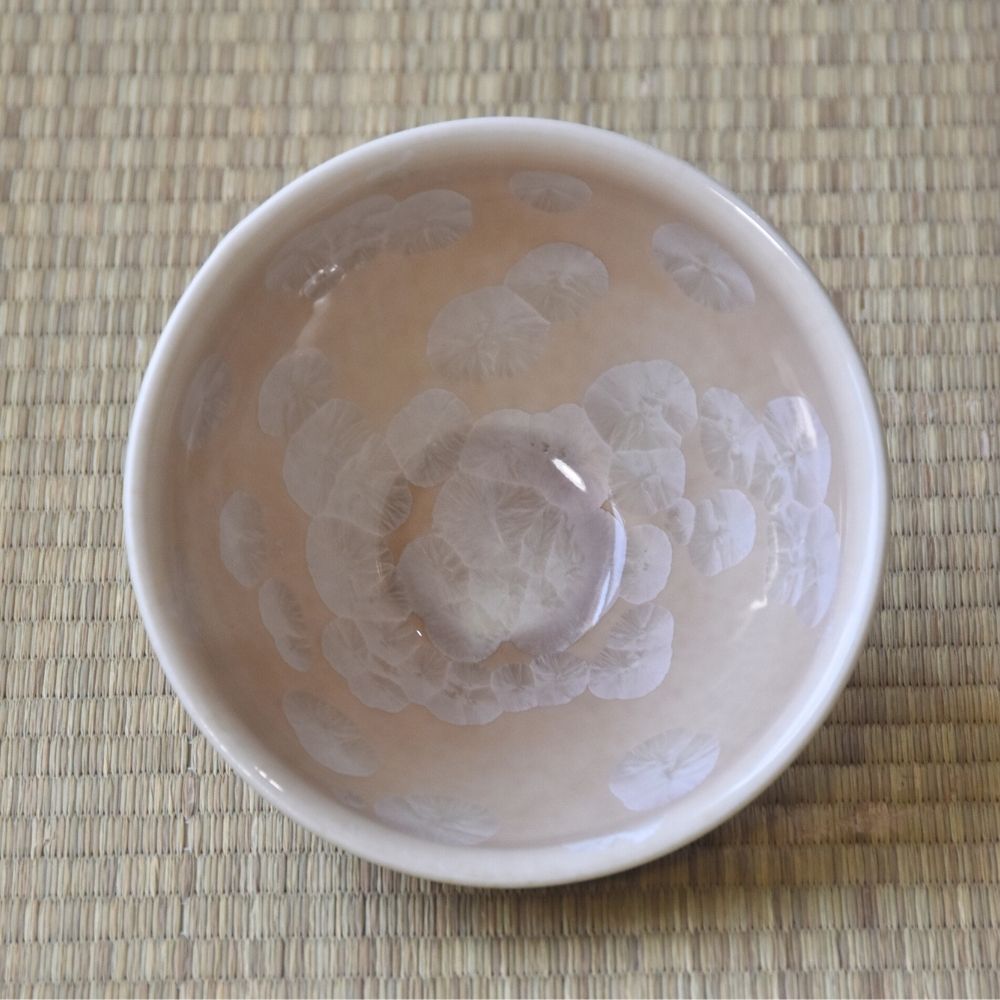 The mesmerizing crystalline patterns—resembling blossoms blooming on the surface—are created naturally as minerals within the glaze crystallize during the firing process. Depending on the angle of the light, the appearance of the pattern subtly changes, adding depth and beauty to each piece.