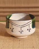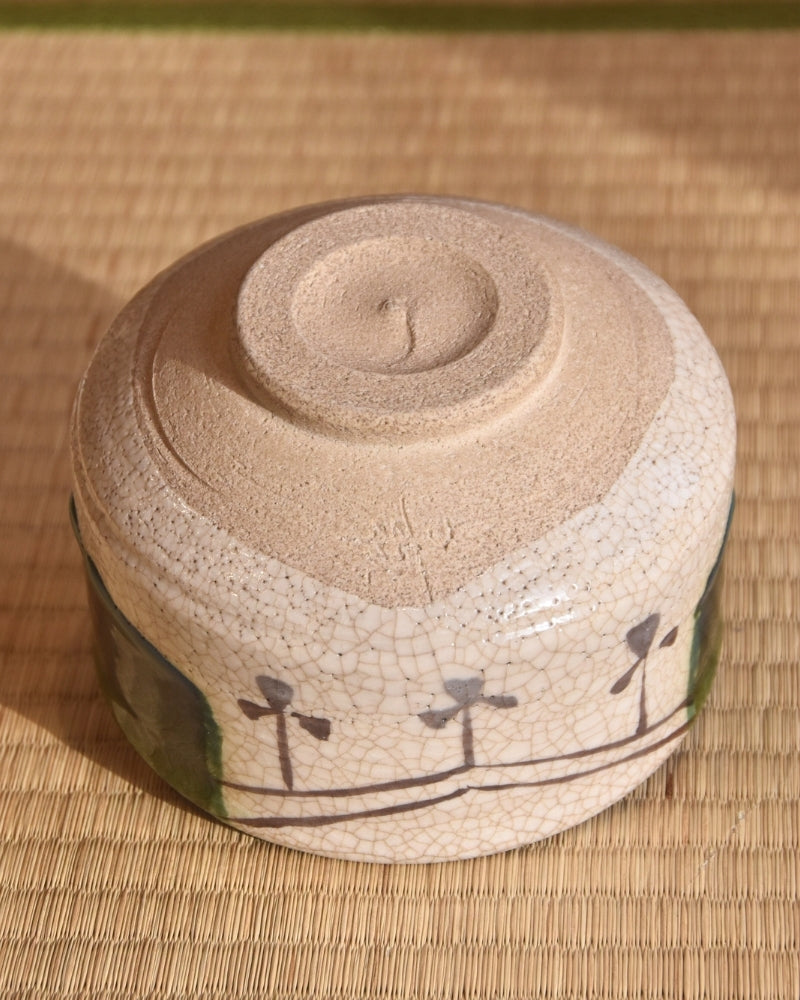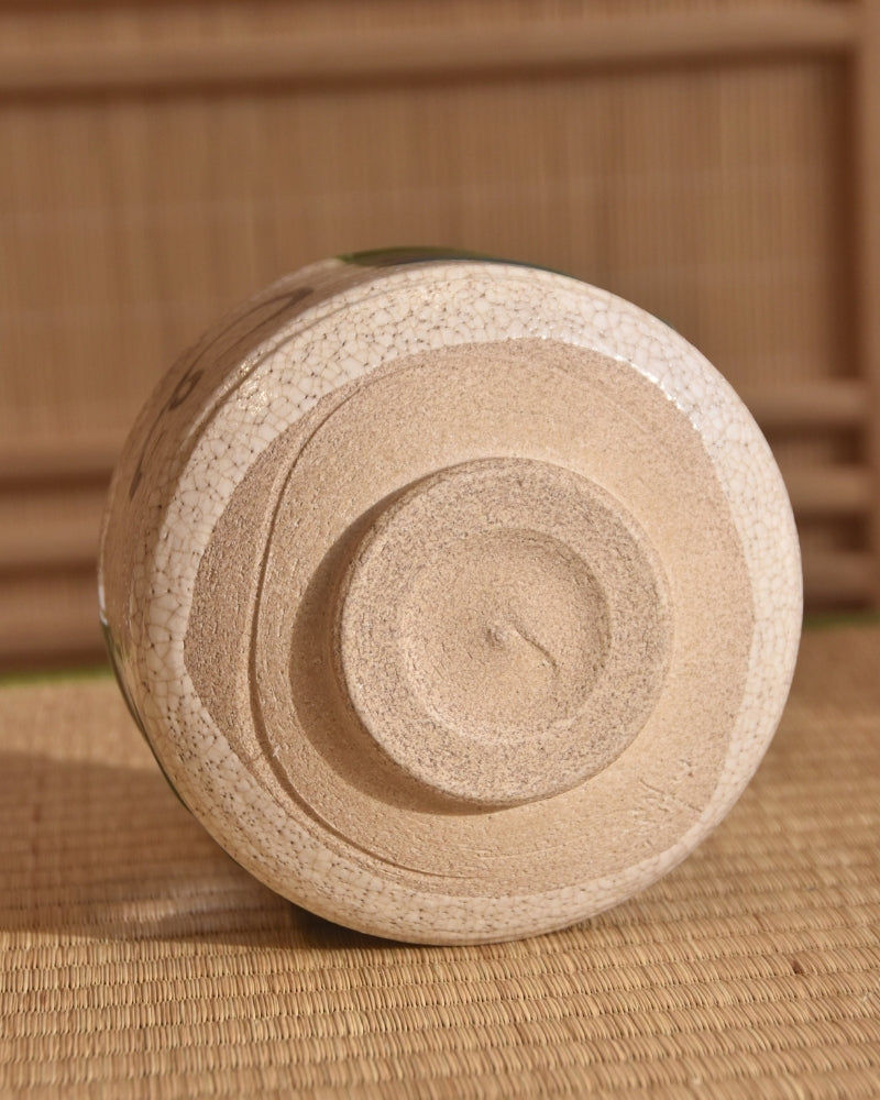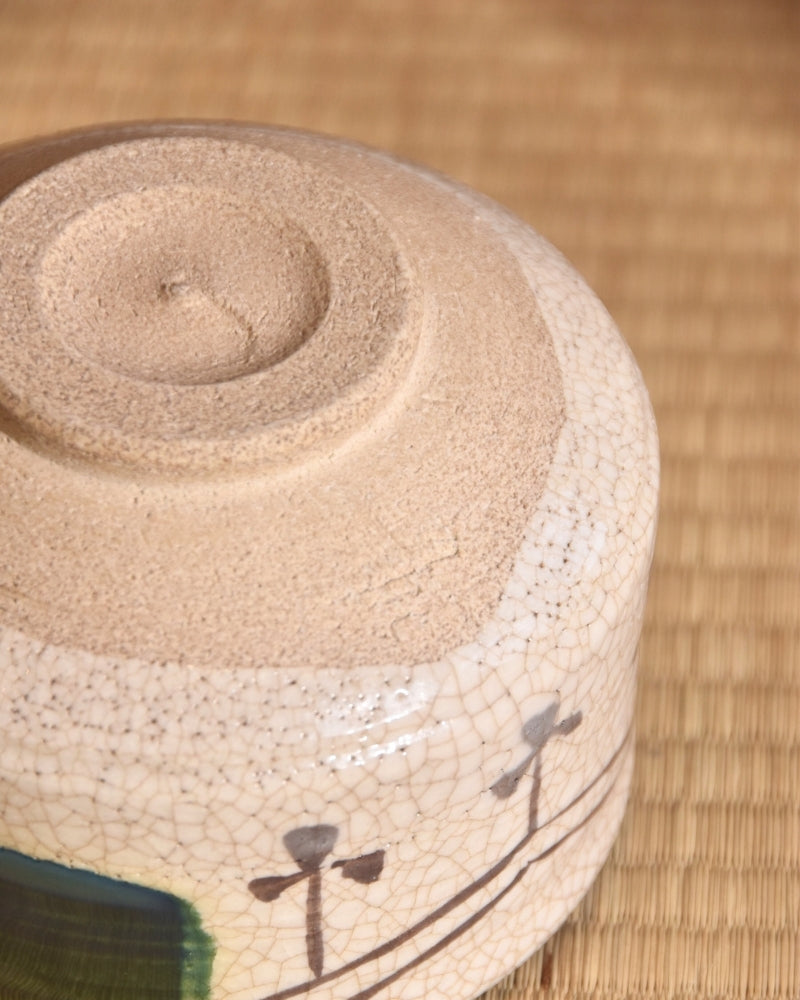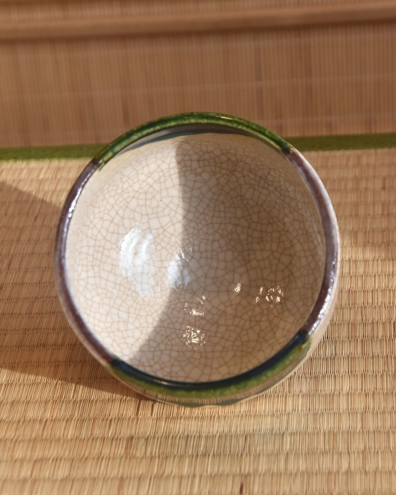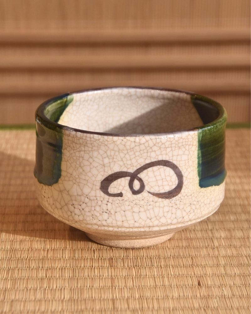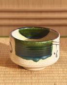 Oribe is a type of Mino ware that originated in the Azuchi-Momoyama period and was named after the daimyo tea master Furuta Oribe from Mino. It is known for its innovative shapes and patterns that defied traditional tea ceramics. Characteristic designs include intentionally distorted tea bowls and fan-shaped vessels, often featuring geometric patterns like checkered or lattice designs. Oribe ware is commonly recognized for its use of copper-green glaze, which gives the pottery its distinctive green color.