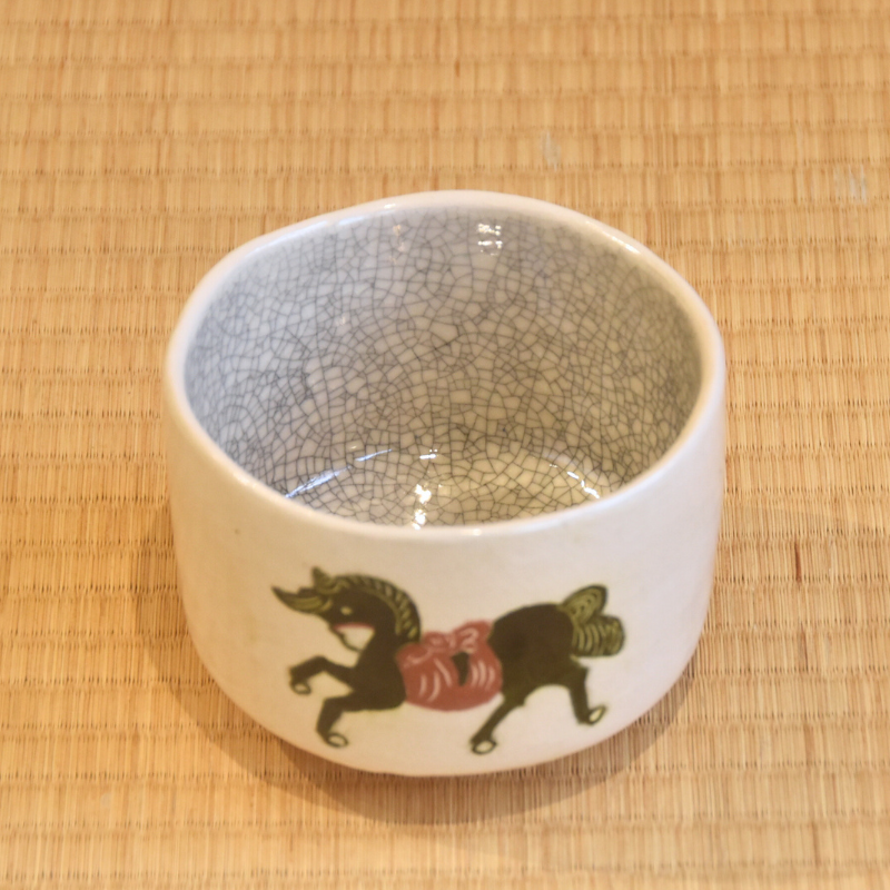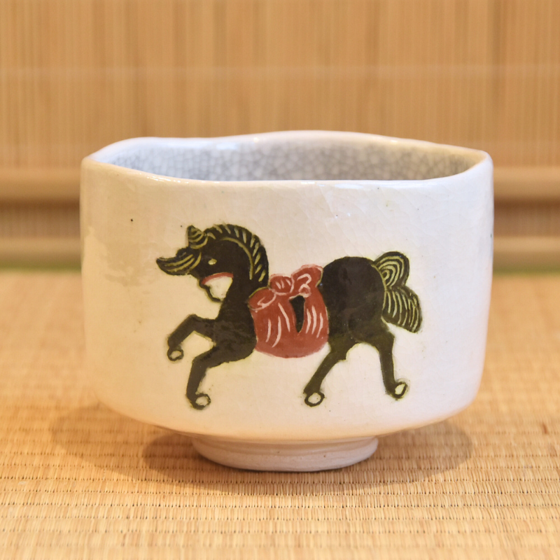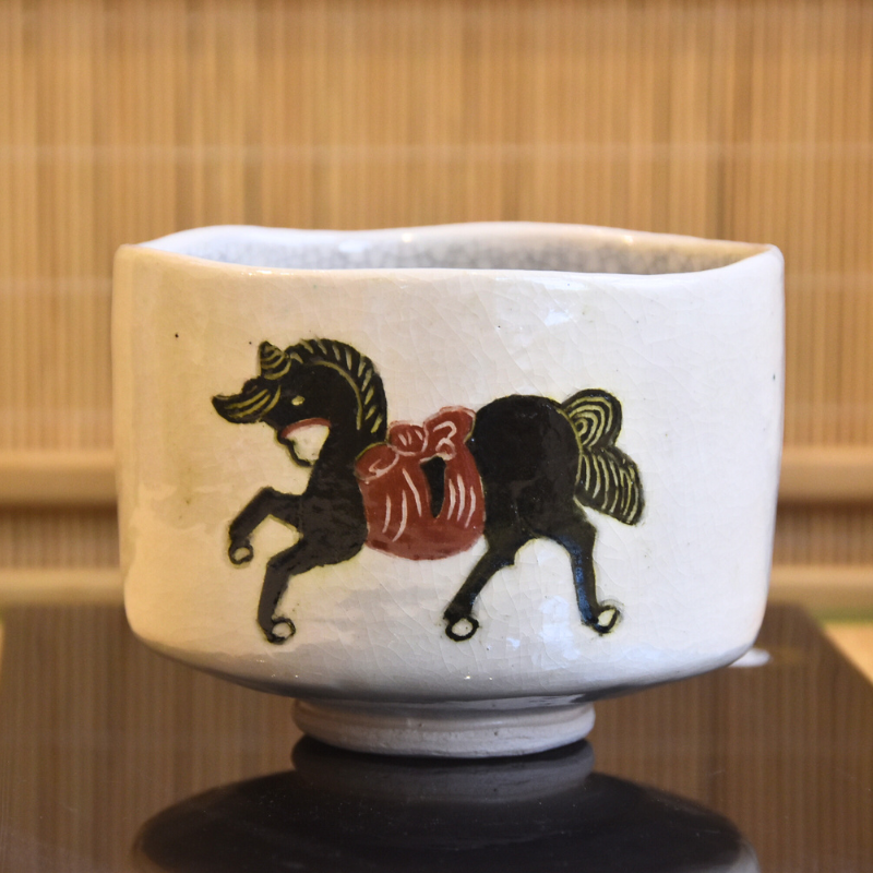 This White Raku (Shiro-Raku) matcha bowl by Waraku features a hand-painted horse motif, symbolizing strength, vitality, and good fortune in Japanese culture.