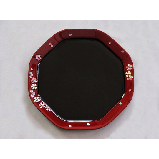 This refined hachiryo-bon (eight-sided tray) features a graceful cherry blossom motif in raden (mother-of-pearl inlay).