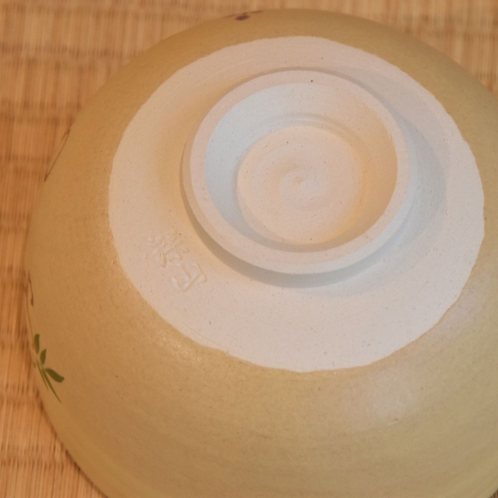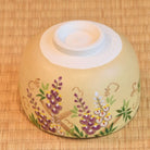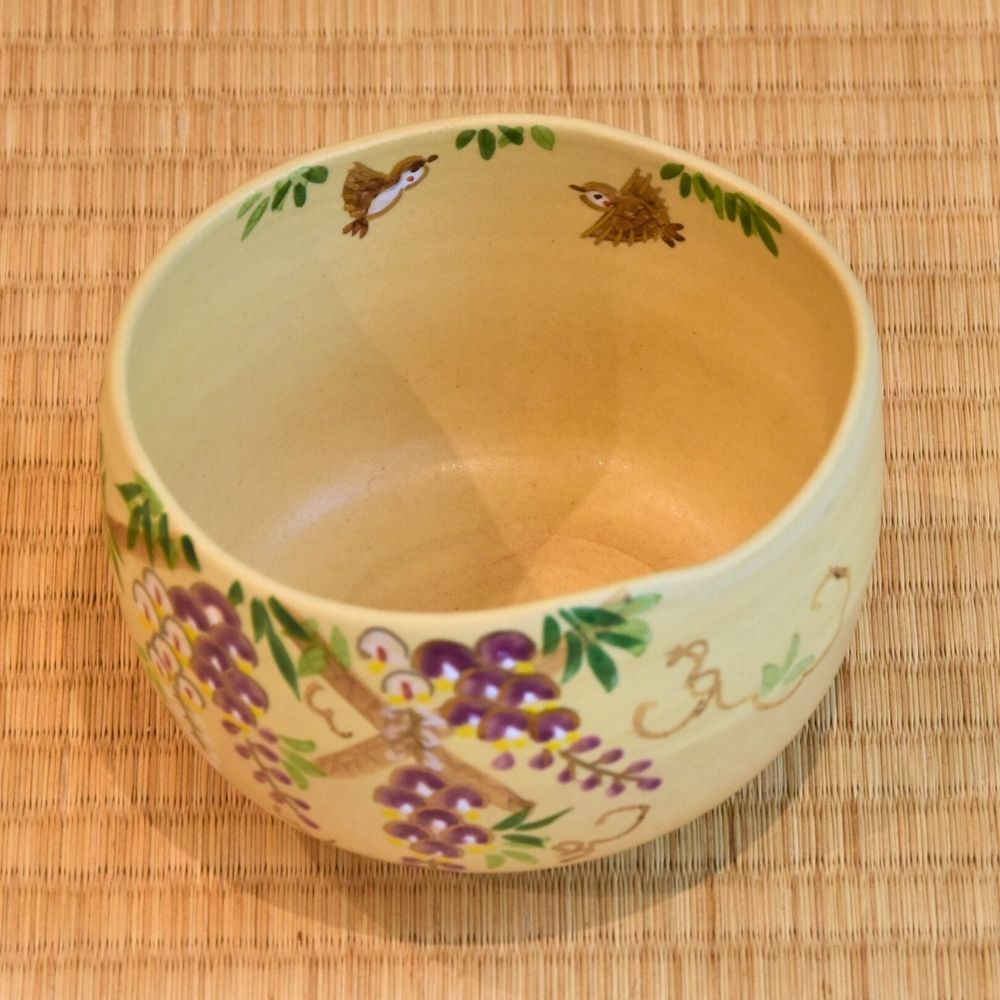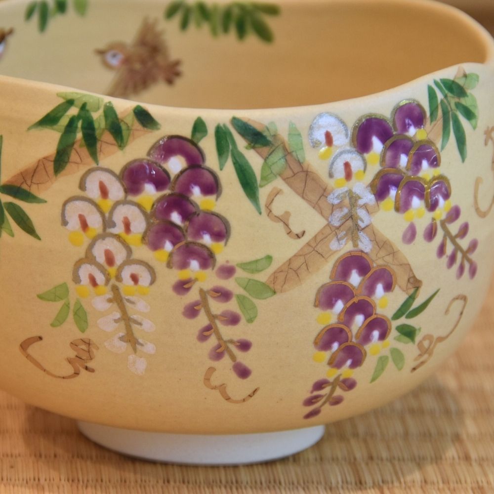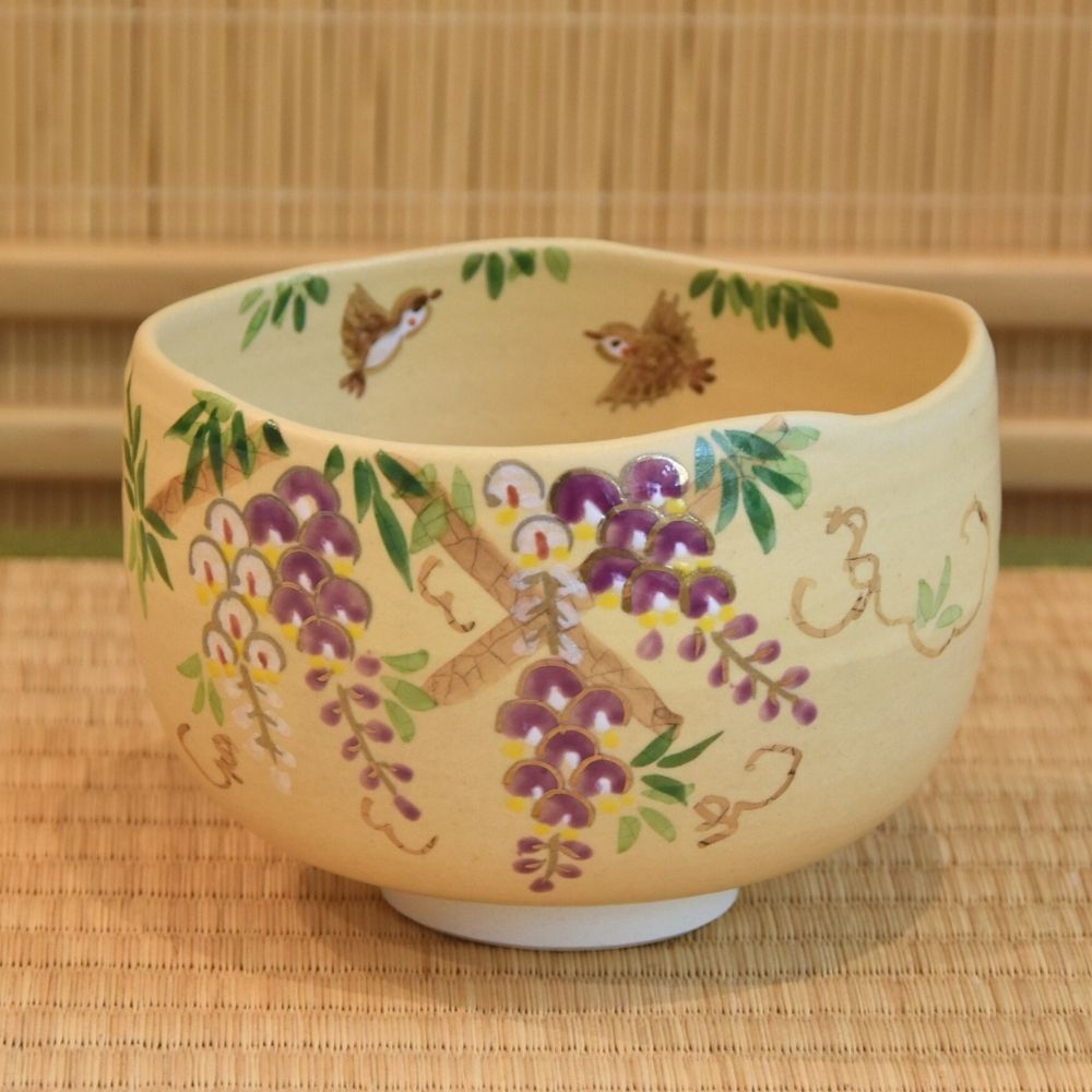 This elegant matcha bowl features a soft ivory base delicately adorned with cascading wisteria blossoms and lively sparrows, symbols of grace and vitality in Japanese art.